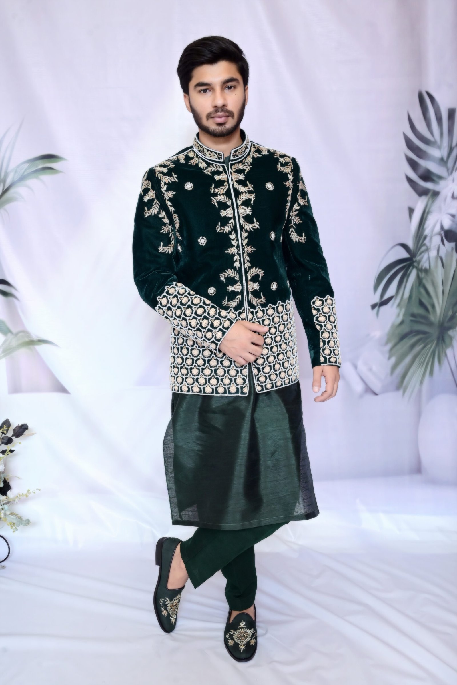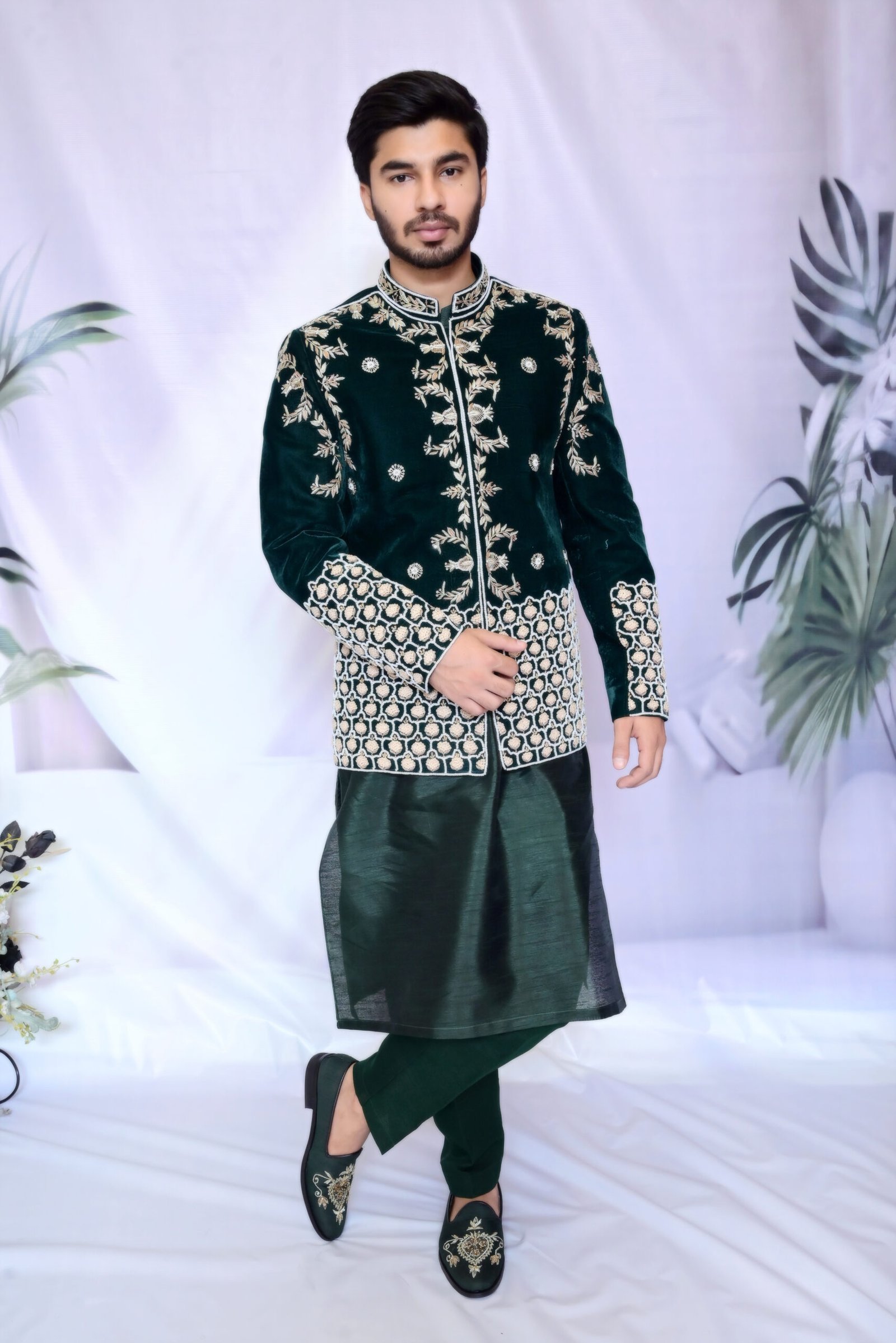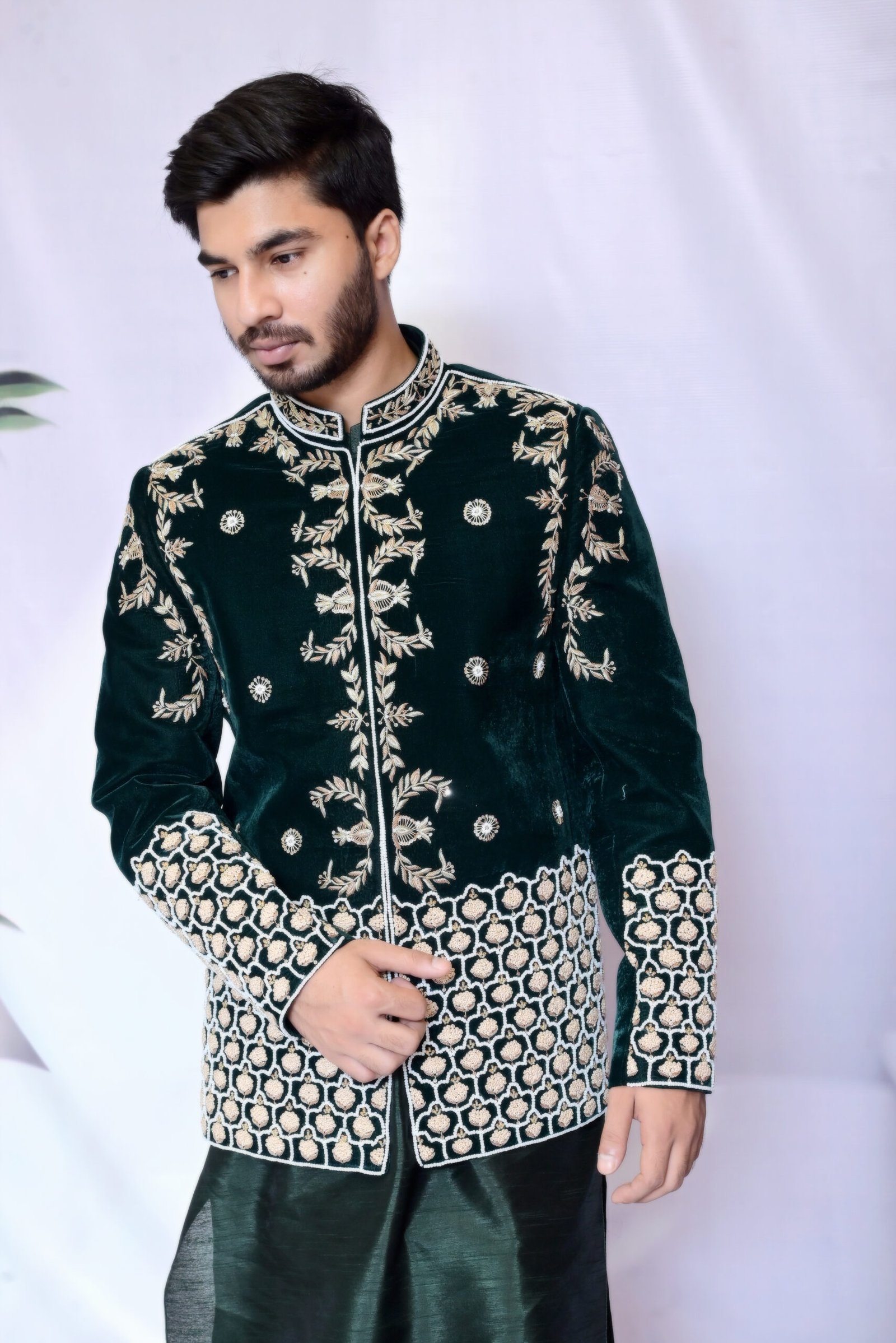 A modern masterpiece. This Structured Dark Green Prince Coat features an exquisite all-over contemporary lattice pattern, perfect for the style-forward gentleman.