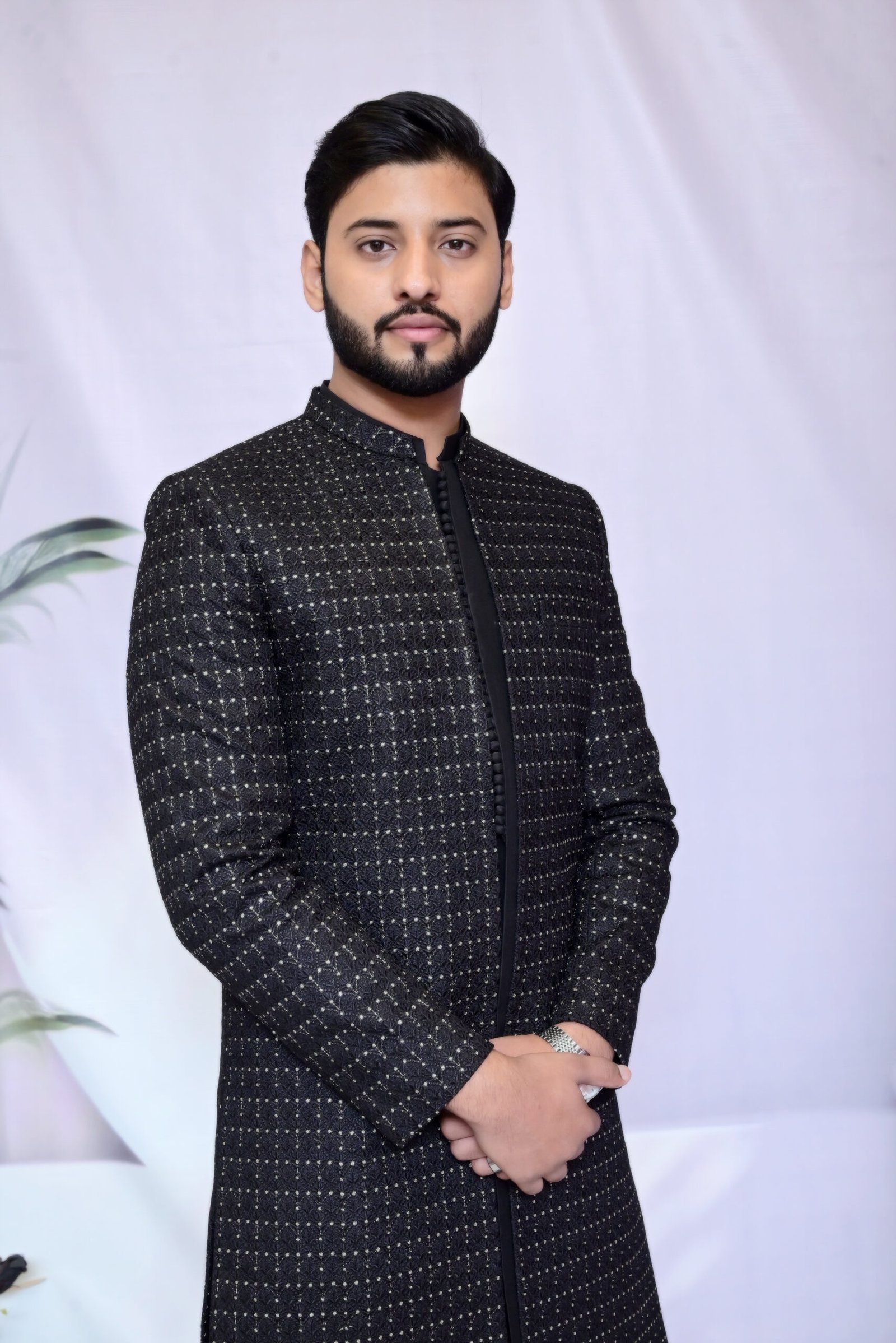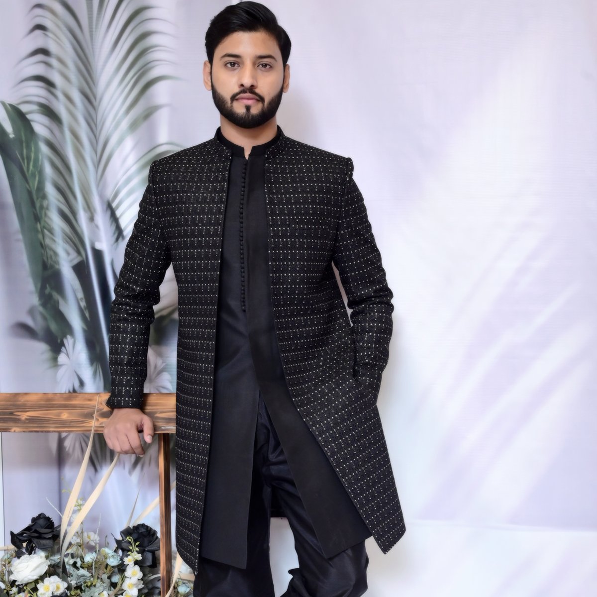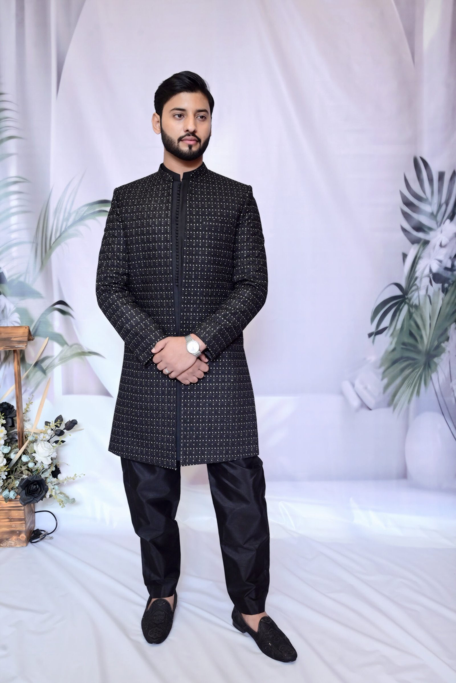 Sleek, structured, and stunning. This Midnight Black Sherwani redefines evening elegance with its luxurious texture and commanding long-line silhouette.
