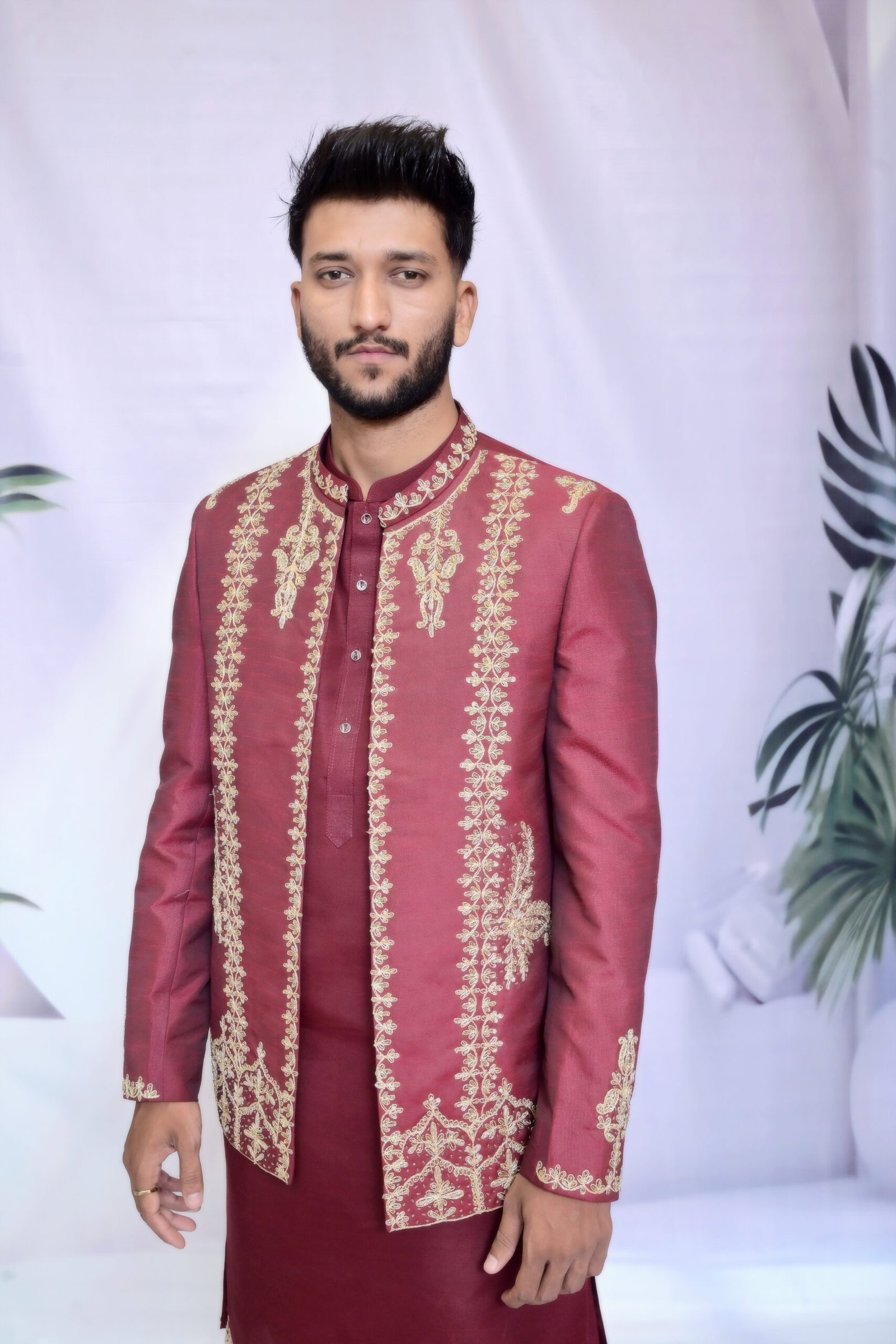 A statement piece crafted for the modern Maharaja. This Regal Maroon Prince Coat, adorned with intricate gold zari work, defines luxury and tradition in one impeccable silhouette.